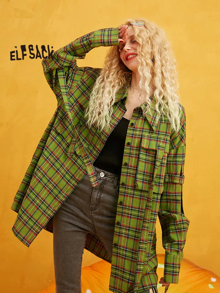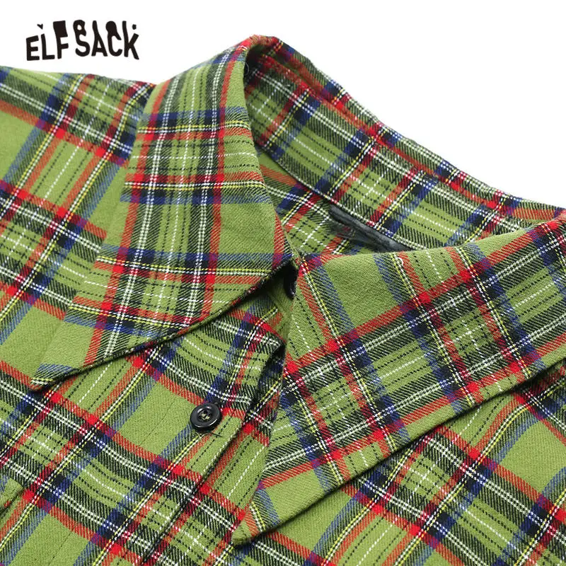 awesome ELFSACK Plaid Brit Graphics Figure Back Blouse Shirt Women 2019 Autumn Single Breasted Drop Shoulde