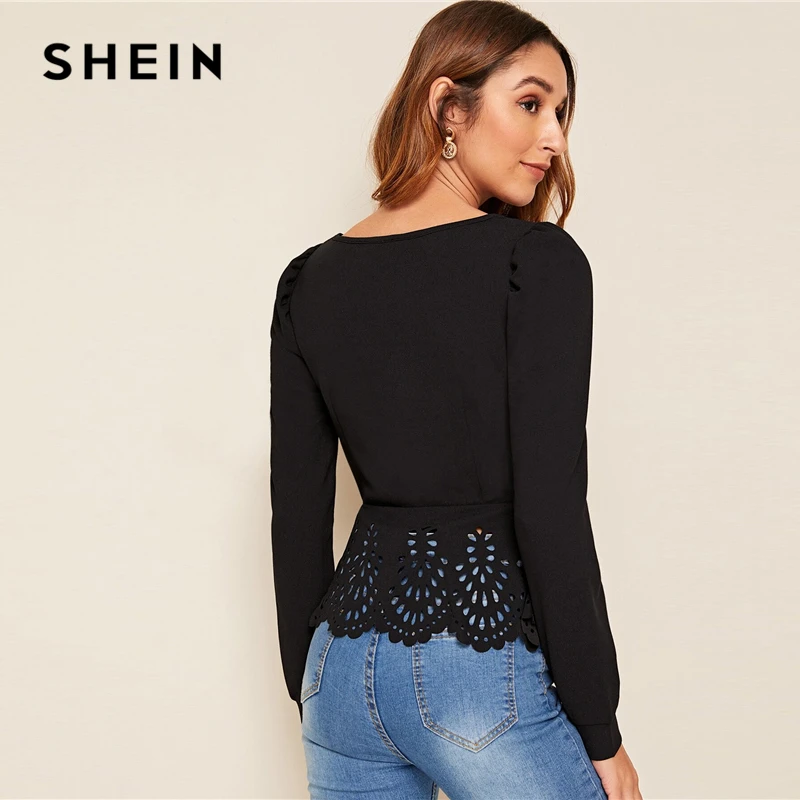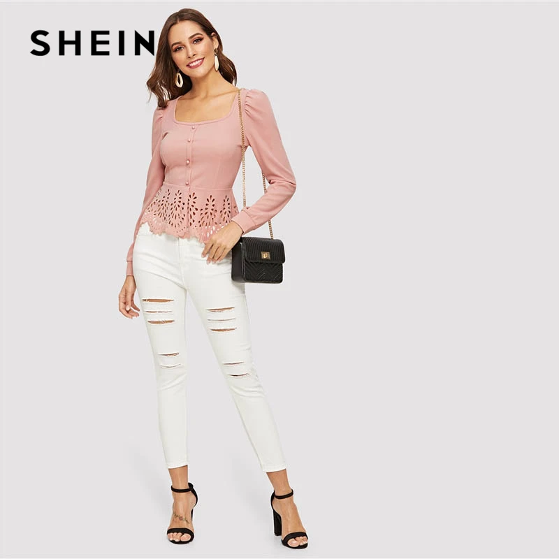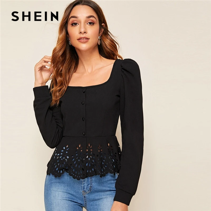 wonderful SHEIN Button up Hollow out Square Collar Peplum Hem Puff Sleeve Blouse Women Tops and Blouses Sprin