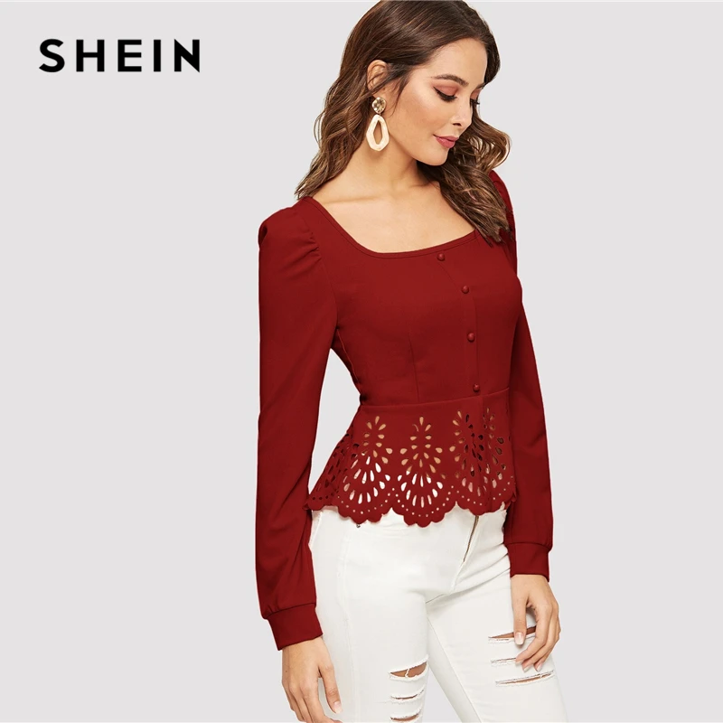 price cut SHEIN Button up Hollow out Square Collar Peplum Hem Puff Sleeve Blouse Women Tops and Blouses Sprin