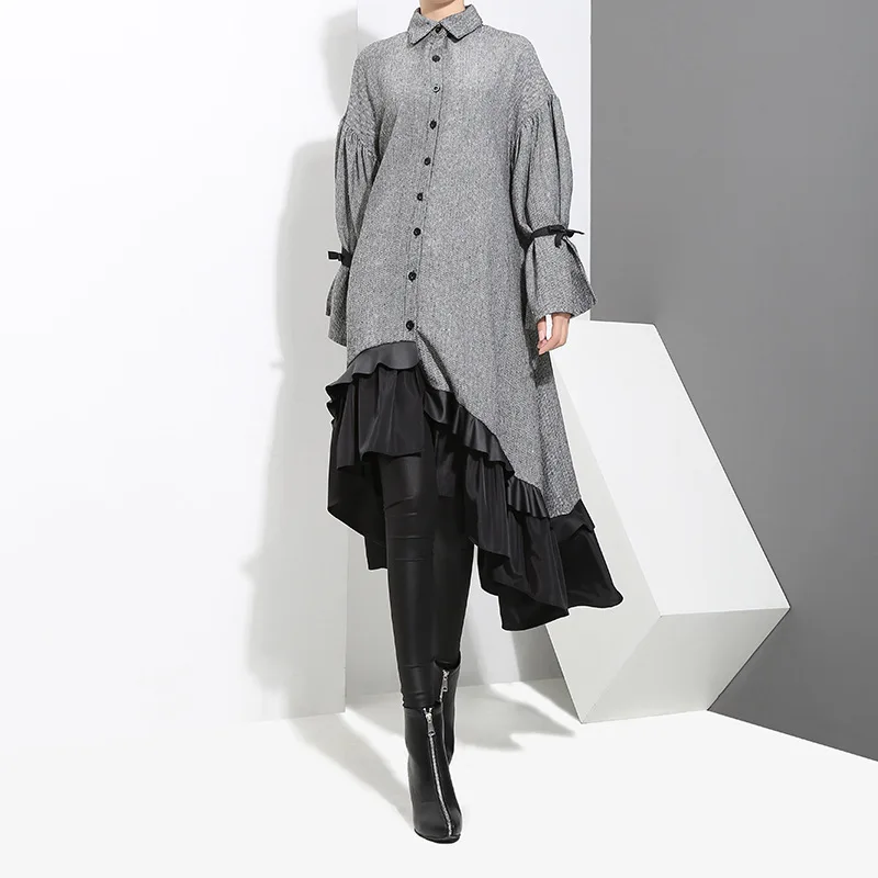 discount [EAM] 2020 New Spring Lapel Long Sleeve Bandage Solid Color Gray Big Hem Irregular Loose Dress Wome